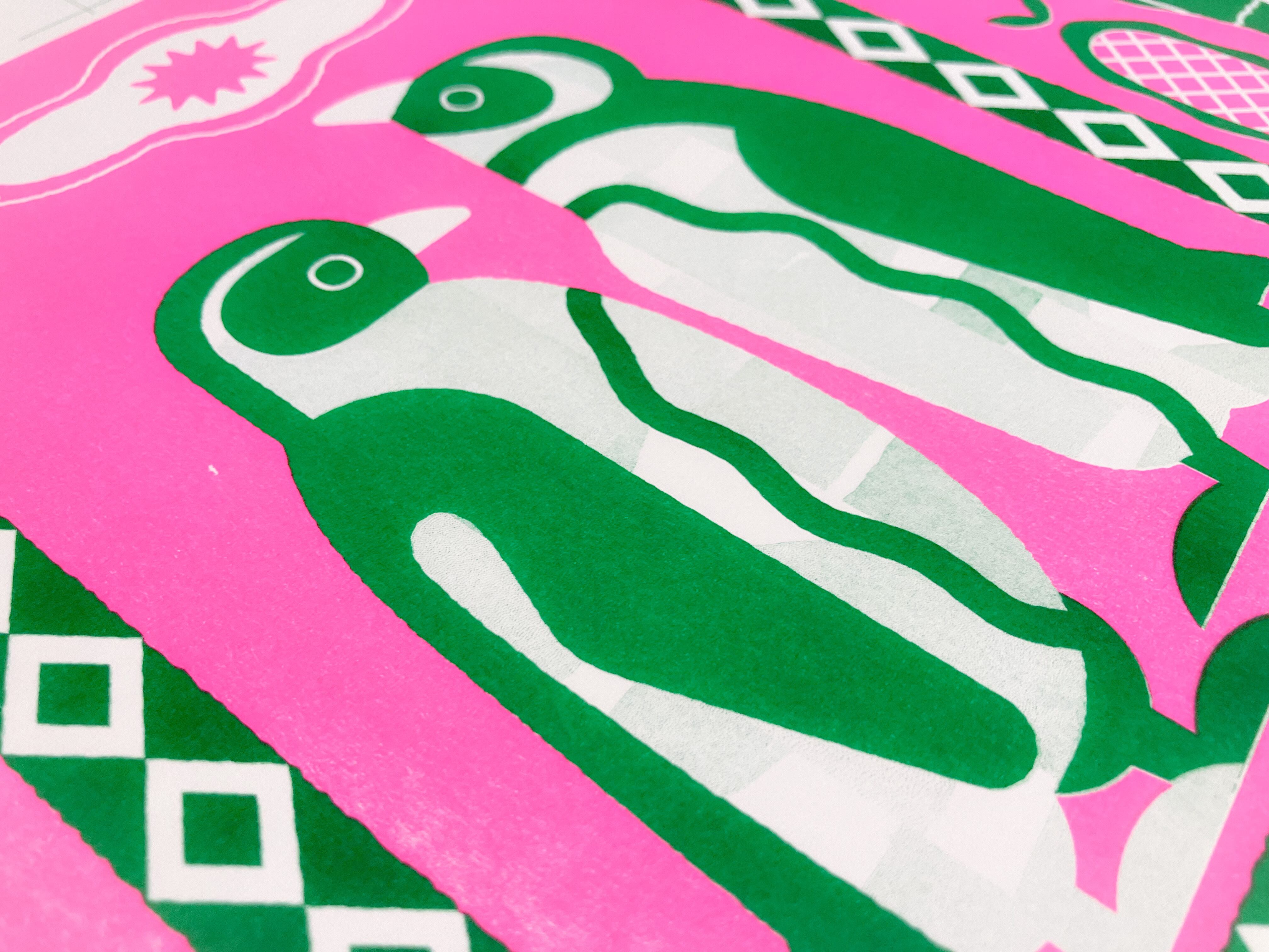 蛍光ピンクとグリーンの印象い的な色使いが特徴的なイラストで、お部屋のインテリアに華やかさをプラスしてくれます。